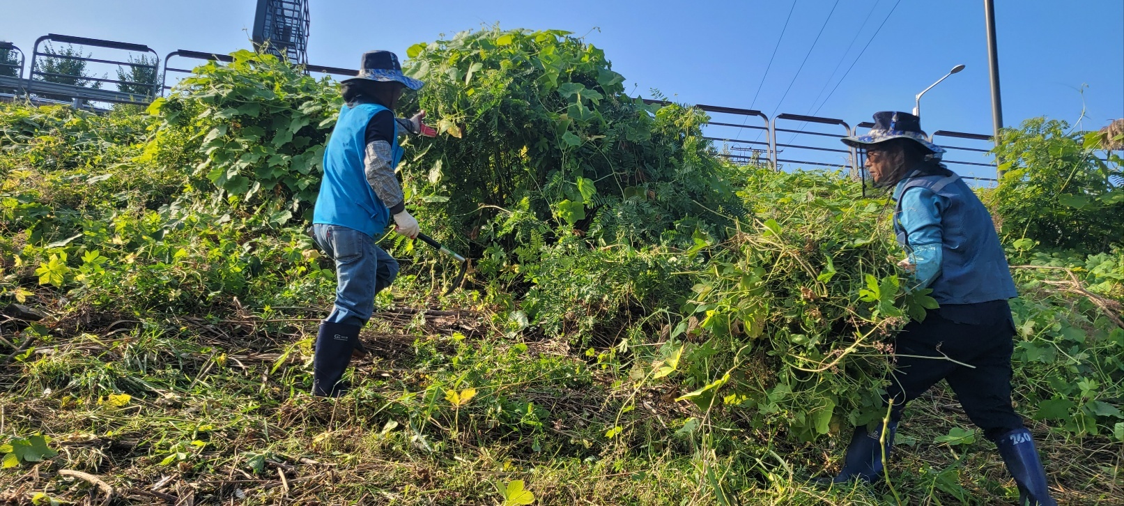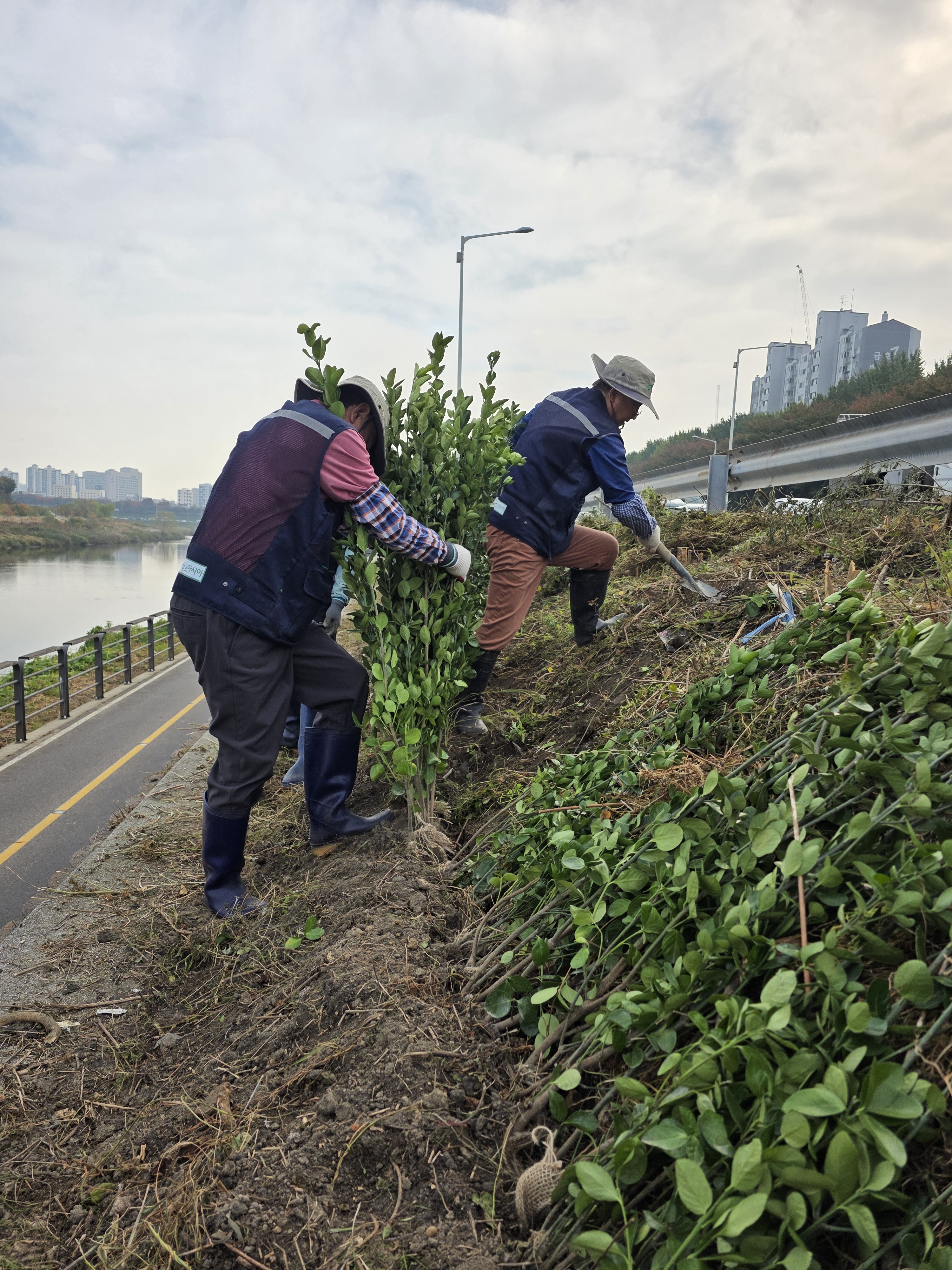 사철나무를 심다가 중간중간 쉴 때 허리를 펴고 중랑천을 바라봅니다. 물가에는 새들이 내려앉아 먹이를 구하고 있고 강물은 윤슬에 반짝거립니다. 바로 곁에는 도로변 차소리가 시끄럽기 이를 데 없지만 우리가 지키는 자연 속 생명들은 애틋하게 마음이 갑니다.